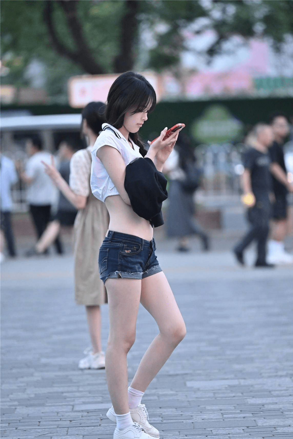 好多美女想要搭配出清凉的效果,可以选择的搭配有很多,低腰短裤,很多年轻的姑娘比较喜欢,低腰的款式,短小的设计,也衬托出青春靓丽的感觉。美女搭配一条深蓝色的牛仔短裤,裤腿是翻边的设计,更有层次感一些,低腰的风格,看着很精致,也看出美女很会搭配自己,要有点自己的想法,搭配出精致的感觉,白色小半袖,衣襟很短的设计,袖子也稍微有一些,搭配出露脐装的效果,也看出美女身材匀称骨感。