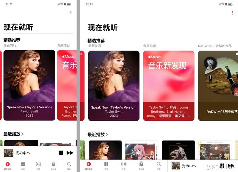Apple Music则会在屏幕展开后把播放栏移到底部,与导航栏合并,布局更加紧凑,为内容留出更多空间。