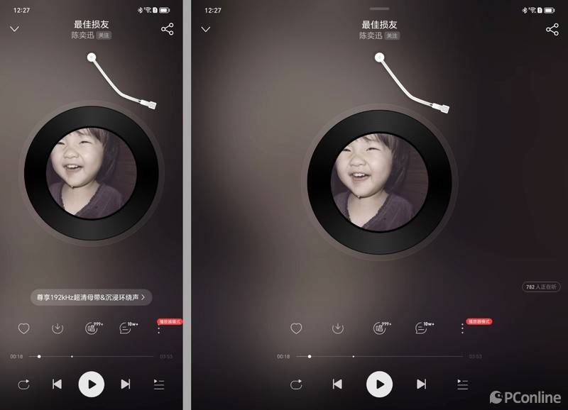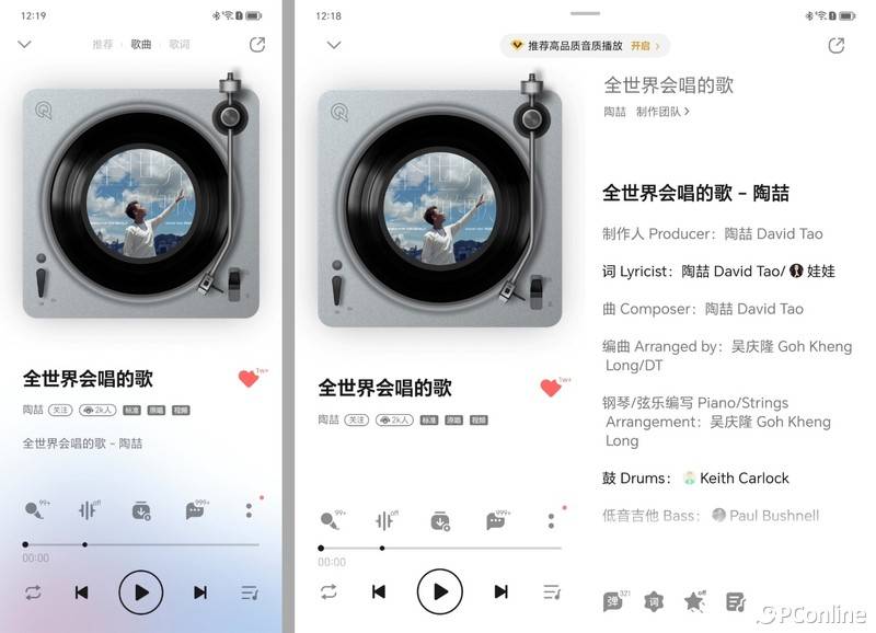 来到播放界面,QQ音乐可以说是“遥遥领先”,在大屏界面下可以同时显示播放界面和歌词界面。可惜的是不能同时显示播放界面和评论界面,点击评论后依旧是全屏显示,