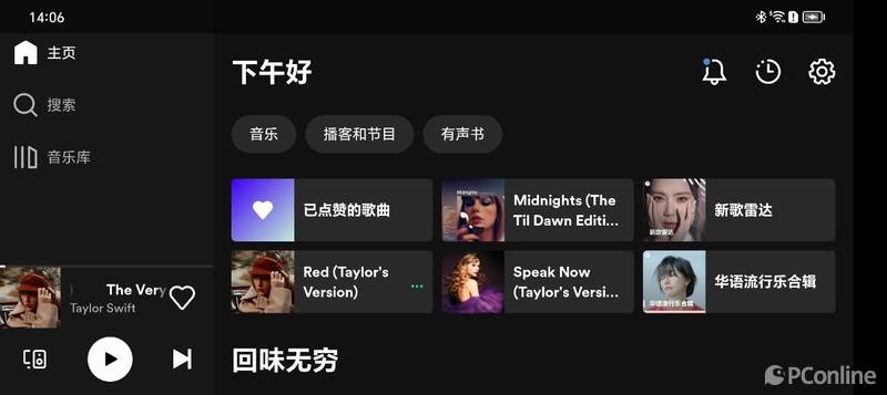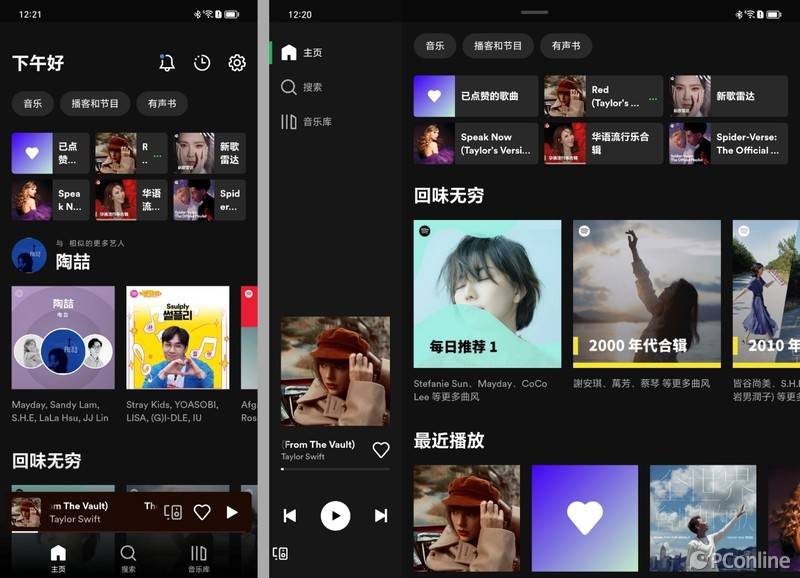 Spotify是这5个app中最特别的,遵循了Android开发者文档中的大屏幕规范化布局,底部导航栏和播放栏在大屏设备上会变成列表排列在屏幕左侧,兼具美观与功能性。值得一提的是,Spotify的大屏布局在直板机上也能通过横屏触发,也是目前市面上极少数支持横屏的音乐播放器之一。