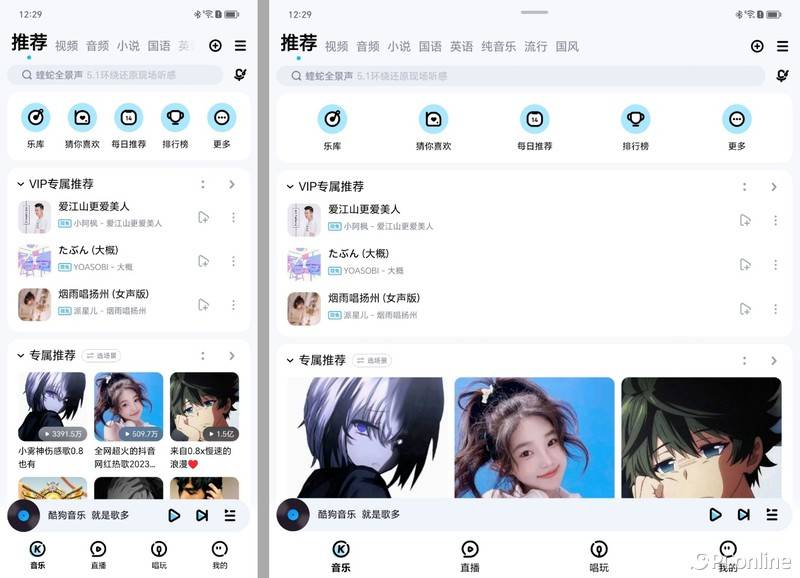 而网易云音乐和酷狗音乐都没有适配折叠屏的界面,基本上只是把原来的界面展开,并不能充分利用大屏优势。