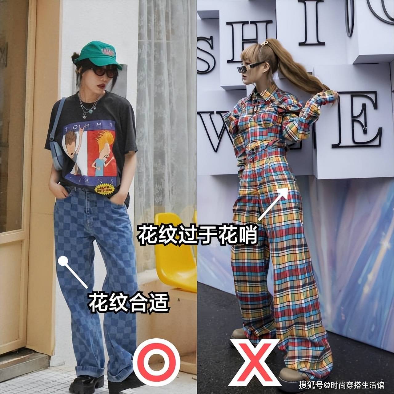 右边这条阔腿裤虽然抓人眼球,但是大面积彩色系的撞色格纹很容易带来视觉上的繁重感,普通人穿起来稍有不慎就会变成行走的“麻袋”。而左边这条浅蓝色菱形格纹牛仔裤,低调的颜色在保留了个性的同时,又不至于过于突兀。