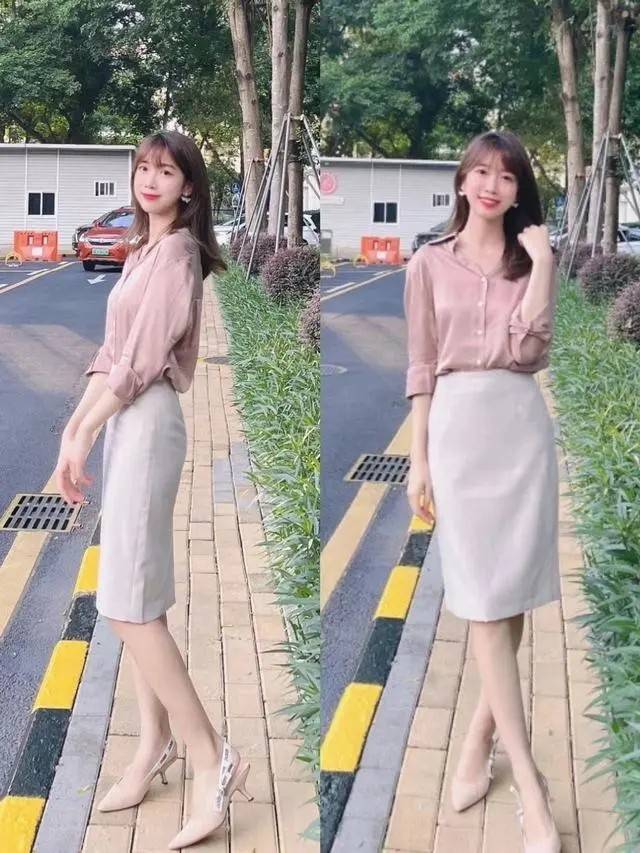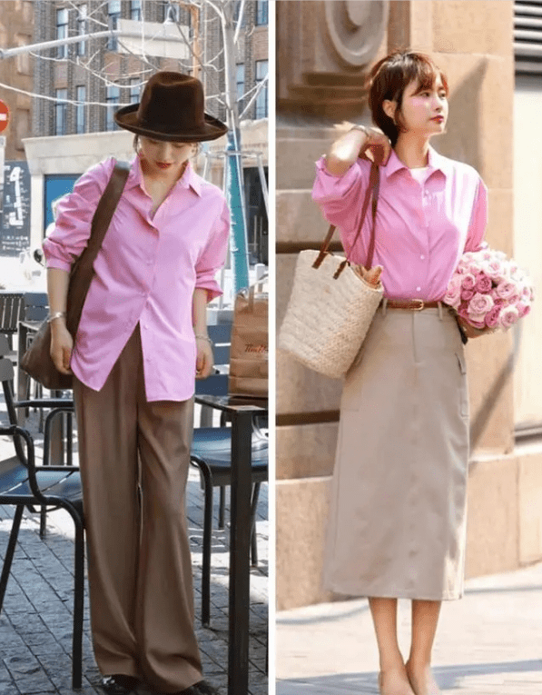 简单的粉色衬衫搭配上大地色系的下装,在整体的色彩搭配上强调出重点,上半身的粉色衬衫有效的起到提亮肤色的效果,下半身搭配上大地色系的裤装或者是裙装,将亮色系和温柔的大地色搭配组合到一起,呈现出来的感觉既知性又温柔,还不乏甜美感。