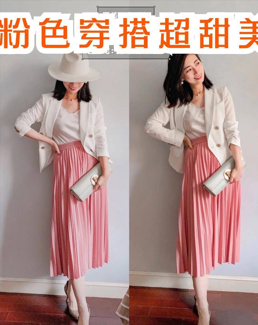 如果你比较注重气场的话,可以使用粉色系的百褶款半身裙来搭配基础的白色小西装上衣,西装风的小上衣穿出足够的利落感,下半身搭配粉色系的百褶半身裙,有效的将裙装的温柔和女人味和西装的利落感结合到一起,既保证了适度的气场不会显得太过软弱,又不会因为粉色裙装的穿搭让整体的造型看上去过分少女化。