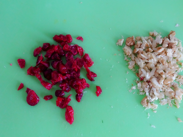 3、蔓越莓干和核桃仁切碎,多少随意,根据所用豆沙馅的量调放就可以,能使豆沙馅揉成团就行