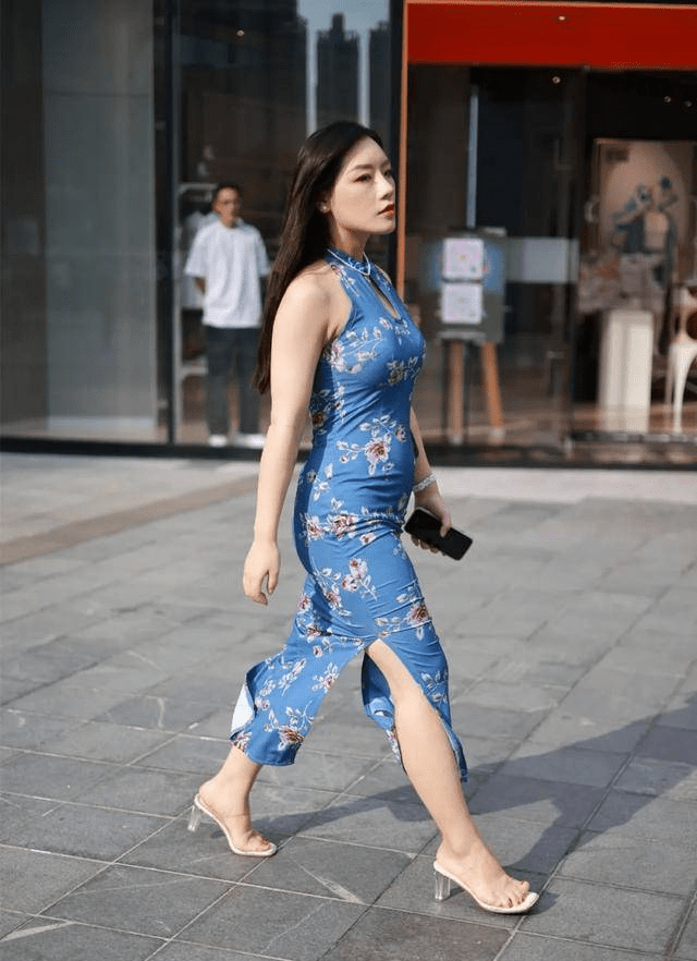 图中女生就很勇敢,选择了经典又复古的旗袍,单独看她一个人,有穿越时空的既视感,这件旗袍在设计师的创作下,已经变成了升级款,衣袖和衣领都大不一样了,舍弃了盘扣和竖领的点缀,而是用挂脖的剪裁来映衬。