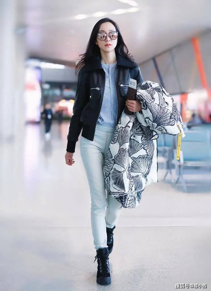 短款的皮衣搭配着高腰的蓝色牛仔裤,黑色皮衣和浅蓝色牛仔裤也在颜色上构成对比,深浅结合的配色展现出了一定的层次感,下半身的牛仔裤又比较修身,让韩雪的双腿线条体现出来,适合腿细腿长的女生,腿粗以及腿型不好看的女孩子尽量不要穿。