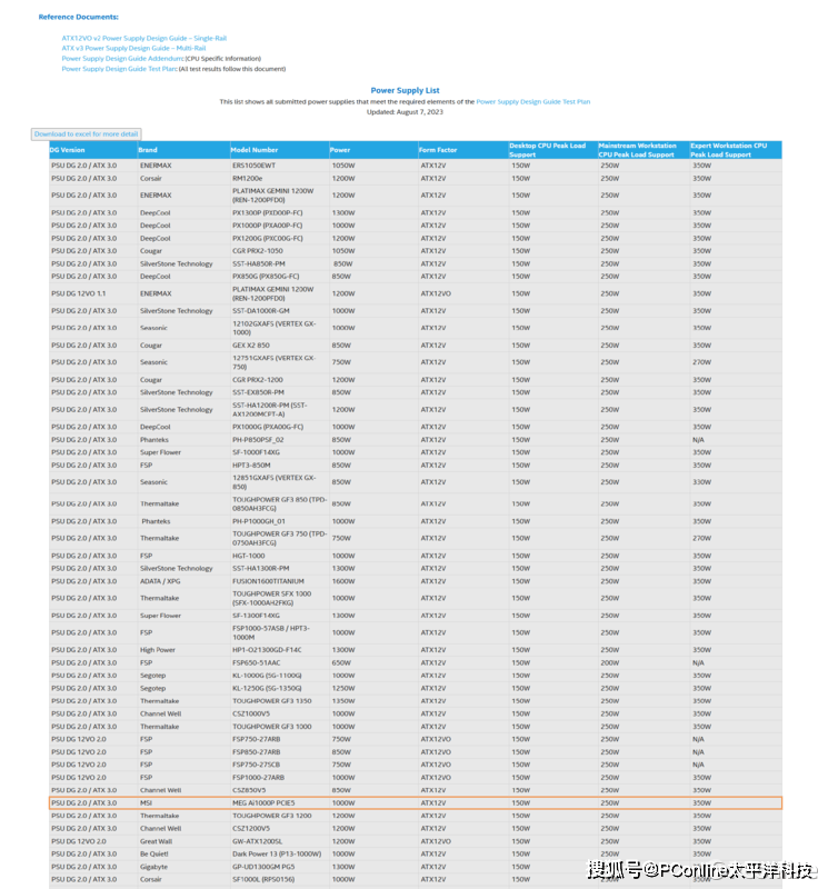 那我们怎么去挑ATX3.0标准电源?其实我们可以考虑一下lntel官方提供的ATX3.0标准电源列表【Intel官方认证,https://compatibleproducts.intel.com/FeaturedLinks/PSU.html】当然这个认证列表是需要把产品送到Intel官方测试,随后定期更新列表上的产品。一般情况下,只要产品足够给力,做工、用料、架构设计,以及转换率较为出色的产品都会通过测试。正如我们最新收到的微星送测的MEG Ai1000P PCIE5电源一样,此是一款能够通过软件来切换12V单路/多路、额定功率为1000W、80PLUS白金牌认证、全模组ATX3.0标准电源产品。