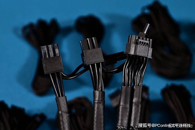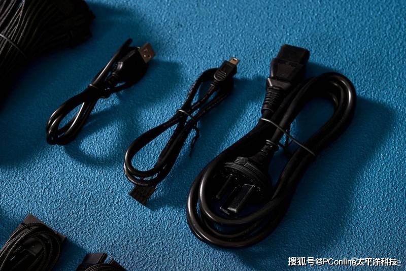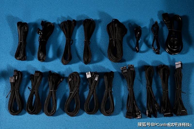 标配的线材是相当的豪华:1条600mm 24Pin ATX线、1条700mm 4+4Pin EPS线材与1条 700mm 8Pin EPS线材、6条600mm 6+2Pin PCIe线、1条600mm 16Pin 12VHPWR线、1条600mm 16Pin 12VHPWR转双6+2Pin线、3条SATA*4线、1条大D*4线、两条Mini USB通信线,以及AC电源线。