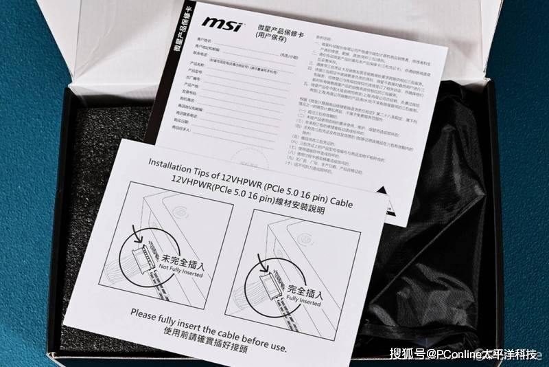 产品说明书,特别强调的是12VHPWR线材的安装说明,当然其实如果微星在这代产品中就已经标配上双色的12VHPWR线材那安装时就更容易了解到接着是否接紧实。
