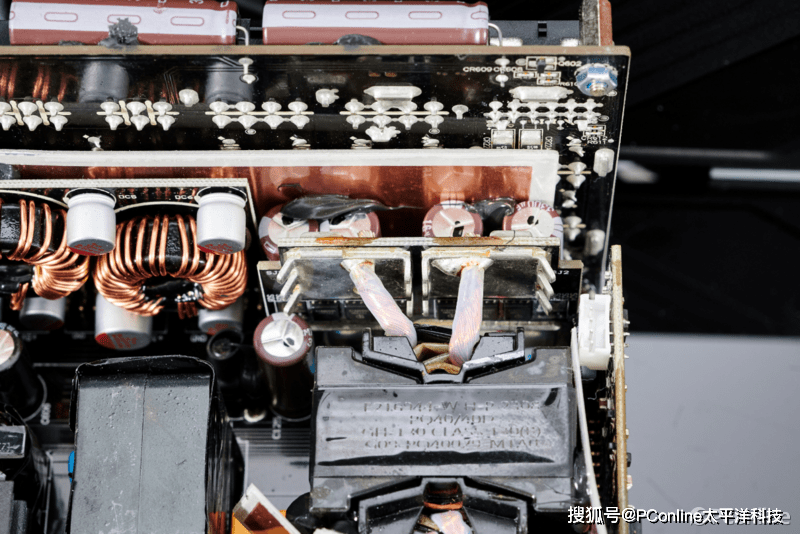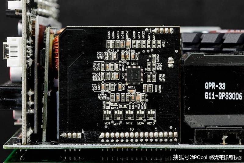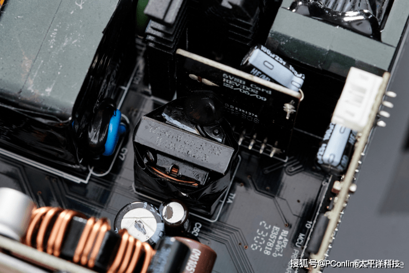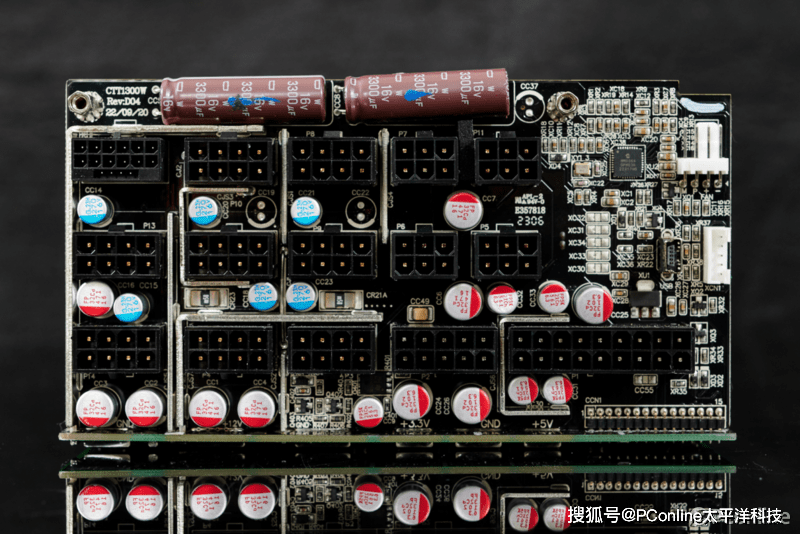 微星MEG Ai1000P PCIE5战神电源采用了交错式PFC+全桥LLC谐振+同步整流+DC-DC结构,PCB布局相当紧凑,所以部分电路采用直插式的PCB子板设计;这套方案来自CWT乔威的CTT平台,是目前顶级半数字控制的电源方案。