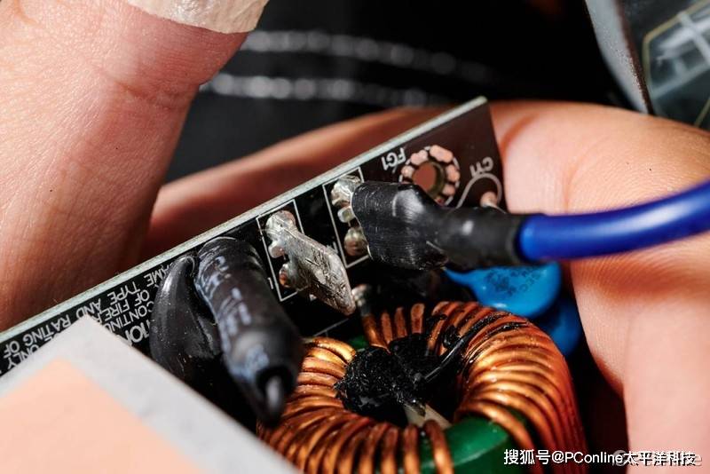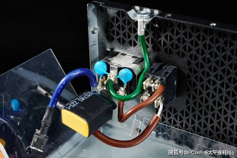 电源拥有较为完整的EMI电路,一级EMI电路直接焊接到AC电源母座上去,带上1对Y电容与1个X电容,其中X电容还套上热缩管进行保护。值得注意的是PCB板上的AC接口端可以拔掉。
