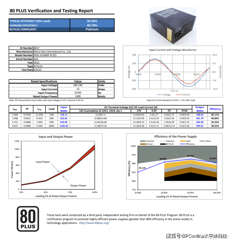 由于目前专业的测试设备在返厂维修中,所以我们本次电源测试仍是无法为此款微星MEG Ai1000P PCIE5战神电源详细的测试。这里我们先来看看80PLUS官方提供的测试结果:在115V 60Hz的环境下,微星MEG Ai1000P PCIE5战神电源测试出来的成绩相当强,转换率曲线处于白金牌认证中间,100%负载测试更是达到的钛金认证的水平,可以说是目前各大ATX3.0标准电源中处于第一梯队的档次。