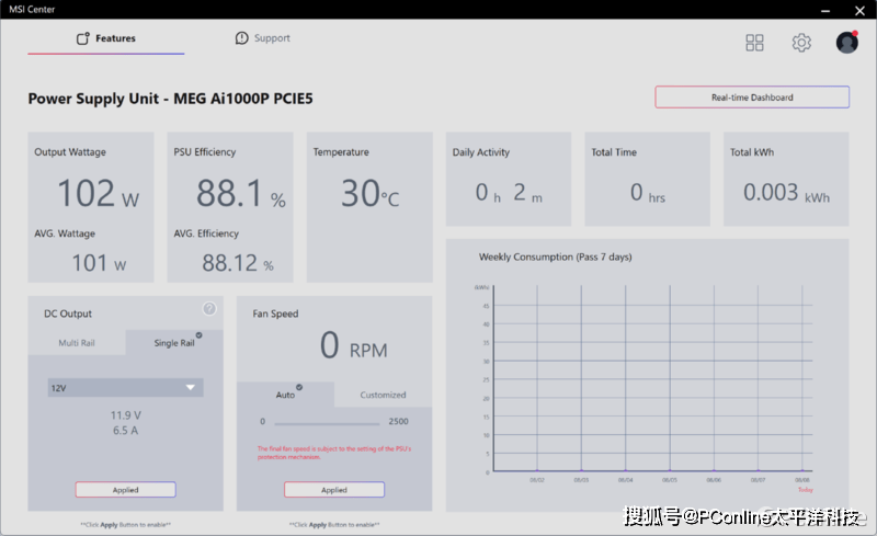 测试专业的测试设备就不能做电源测试了吗?刚好微星MEG Ai1000P PCIE5战神电源是一款半数字控制的电源,通过MINI-USB接口,我们可以监控到电源各电压电流状态、转换率、温度、风扇转速,以及输出接口的功耗等相关信息,还能实现+12V DC单路或是多路输出的控制,那么我们直接上平台进行测试。