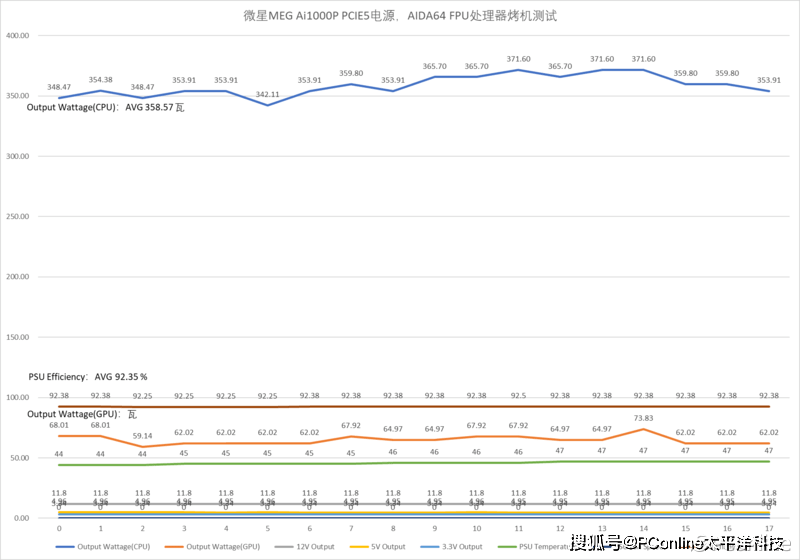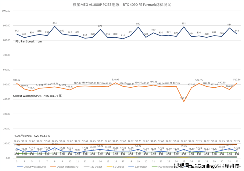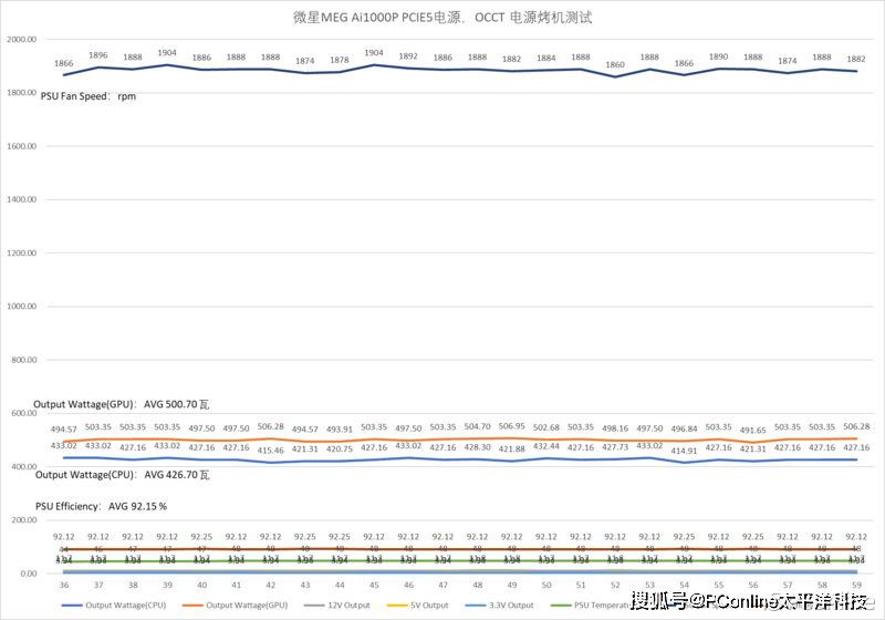 FPU+Furmark双烤?不,其实OCCT的电源烤机模式才是最折磨整个平台功耗的,+12V中输出给显卡的平均功率为500.69W,显卡同样是重度负载情况+12V平均输出功率426.70W,两者相比平台已经达到927.39W,已经达到了微星MEG Ai1000P PCIE5战神电源的90%负载水平,平均转换率为92.14%,还真的猛,这转换率其实已经达到了80PLUS钛金水平。
