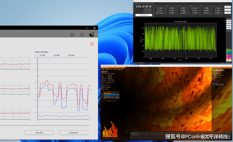 最后我们还对RTX 4090 Founders Edition显卡 进行了Furmark V2软件的无限流空格操作,利用PCAT软件 ,我们可以看到显卡100ms瞬时最大功耗已经来到了537W,比原TDP的450W已经高不少了,但是整个平台仍在微星MEG Ai1000P PCIE5战神电源的加持下稳定运行。
