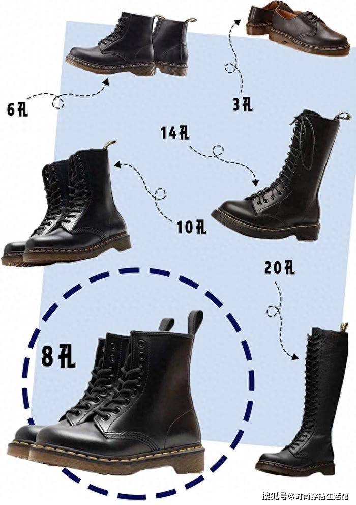 选马丁靴时之所以要看鞋子的孔数,其实也可以理解成看马丁靴的靴筒高度。一般来说,每一个孔口之间的间隔都是固定的,孔数越多的马丁靴,其靴筒高度也会随之上升,若是挑到靴口刚好卡在小腿肚位置上的马丁靴,分分钟就会穿出显腿胖的效果来。