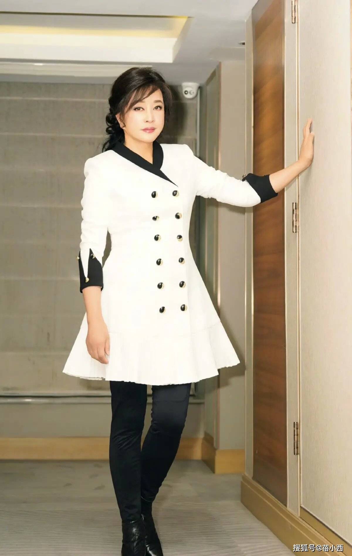 如果想要穿连衣裙,又不想打扮的太花哨,也可以用基础色去呈现出好气质,像刘晓庆所穿的这身时尚白色连衣裙,简约的配色体现了高级感,并且配合黑色打底裤搭配,秋冬季节穿也是很合适的。