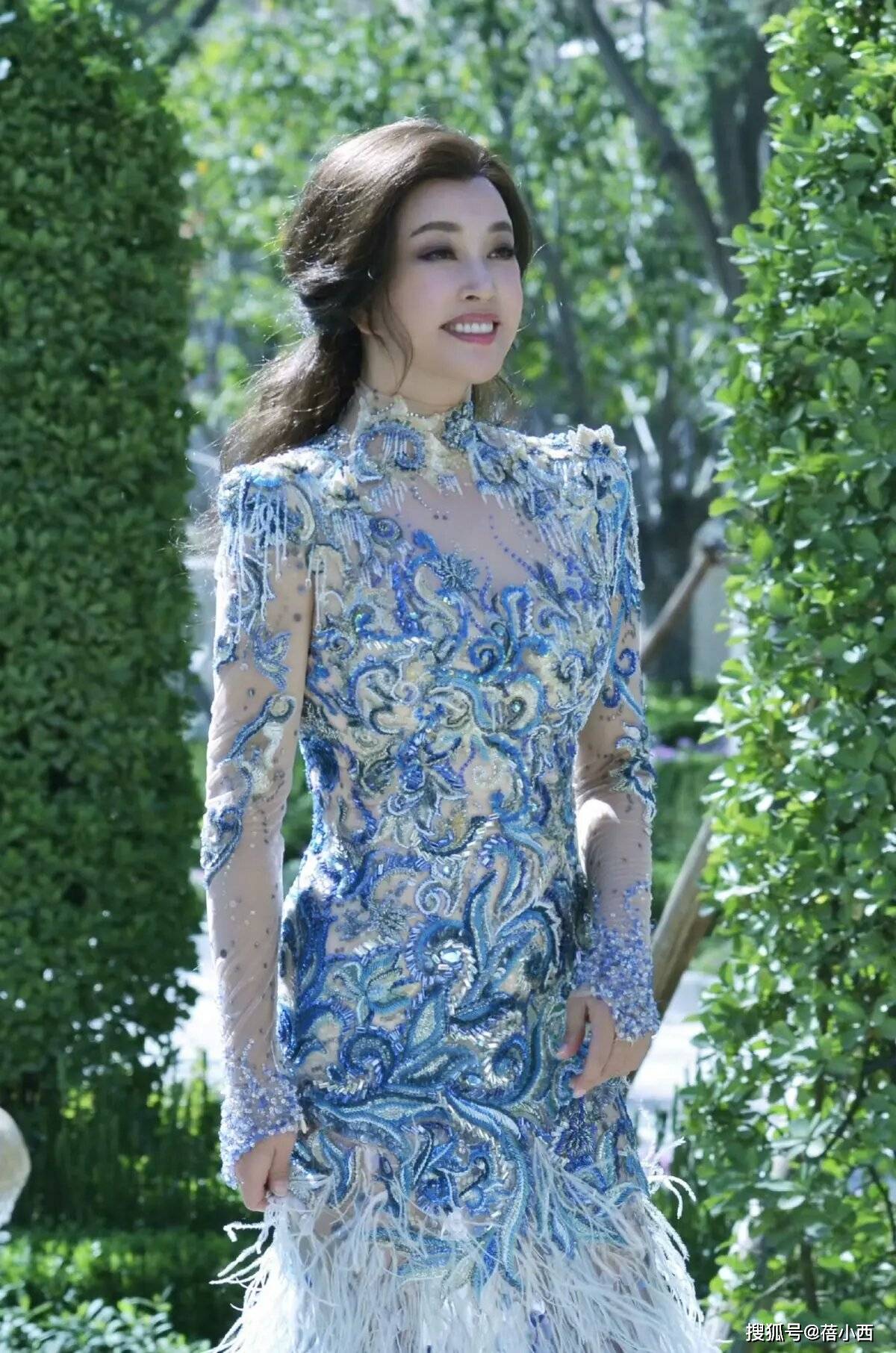 下面这一身蓝色连衣裙特别精致,很适合重要活动时穿,精致的立体花纹勾勒,铺满在上半身,看上去充满东方气韵,再配合微卷的扎发造型,也营造出成熟女性的妩媚气质。