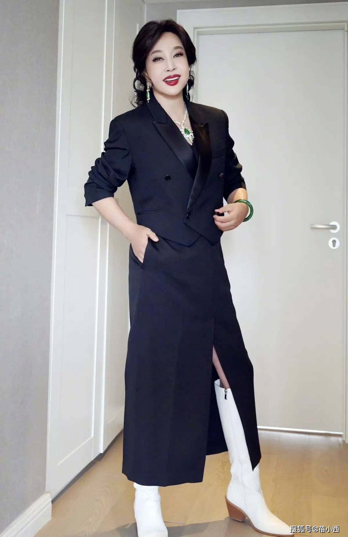 出席活动的时候,刘晓庆的穿搭就非常成熟和性感,她下面所搭配的这身黑色连衣裙侧面的开衩延长了双腿,身材比例看上去确实很好,而且配合短靴去搭配,也体现出了酷酷的风格,和常规的高跟鞋搭配完全不一样。