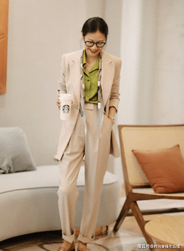 可以适当地在穿搭中加入一些明亮色,保持低调大方的同时更加减龄时尚有活力。大面积的草木绿色难以驾驭,以V领设计的衬衫出现,用大领口露肤进行色彩过渡,清爽又显瘦。