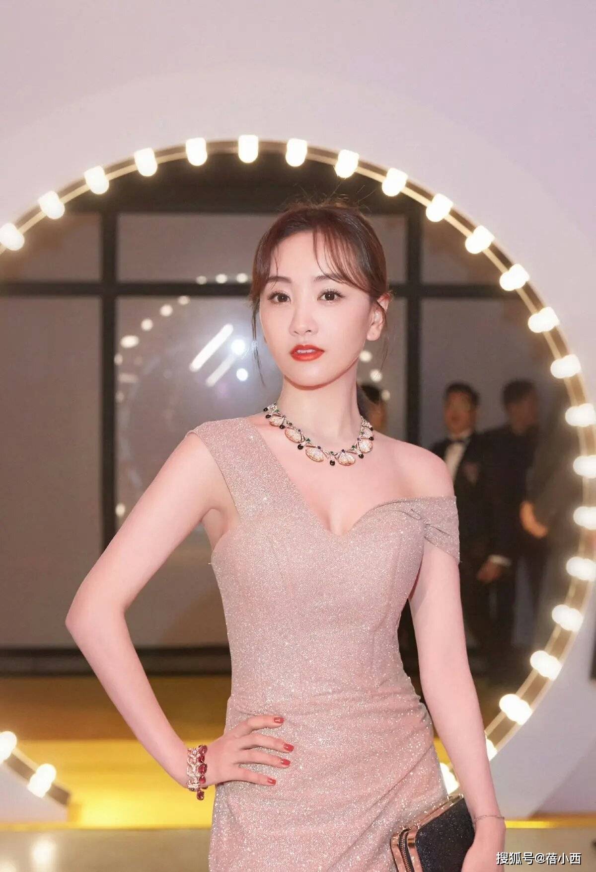 选择连衣裙的时候,颜色至关重要,要根据我们个人的皮肤去挑选,千万不能随意选择自身肤色hold不住的裙子,而杨蓉所选择的这身裸色连衣裙,色彩温柔又知性,饱和度低的裸色穿在身上也很衬肤白,同时还融入了亮片的元素点缀,亮晶晶的也更能够提升精致感。