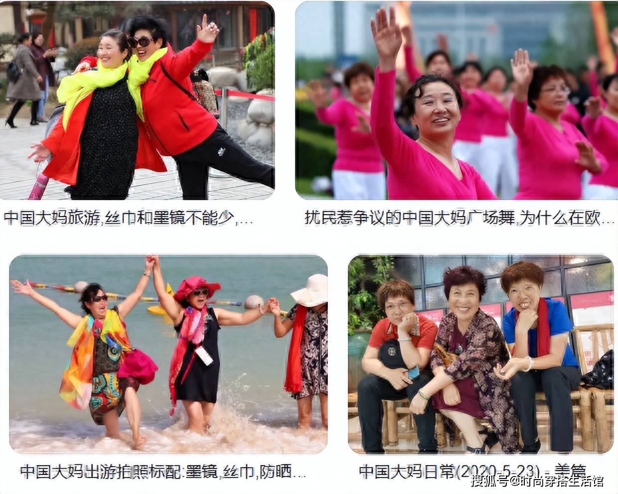 “大妈”本来是人们对年长妇女的一种尊称,但在“白幼瘦”审美的裹挟下,加上人们的审美与时代潮流趋势有关,如今国内大妈们的一些打扮不太符合当下年轻人审美,“大妈”二字,反而成为了一种嘲弄他人老气+土气的词汇。上网搜索中国大妈,出现的都是一些桃红柳绿的图片。