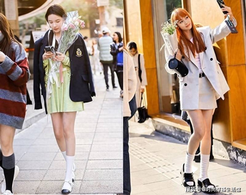 最近很流行穿袜子,之前大家都喜欢露脚踝,但是这样做的人多了,就显得很俗了。现在大家都开始花式秀袜子,即使是在夏天穿着凉鞋,都要穿一双长长的袜子来彰显潮流。半腿袜于是流行起来,这种新潮流确实非常减龄,穿上很有学生气,特别是再搭配上半裙或短裤,就更减龄了。