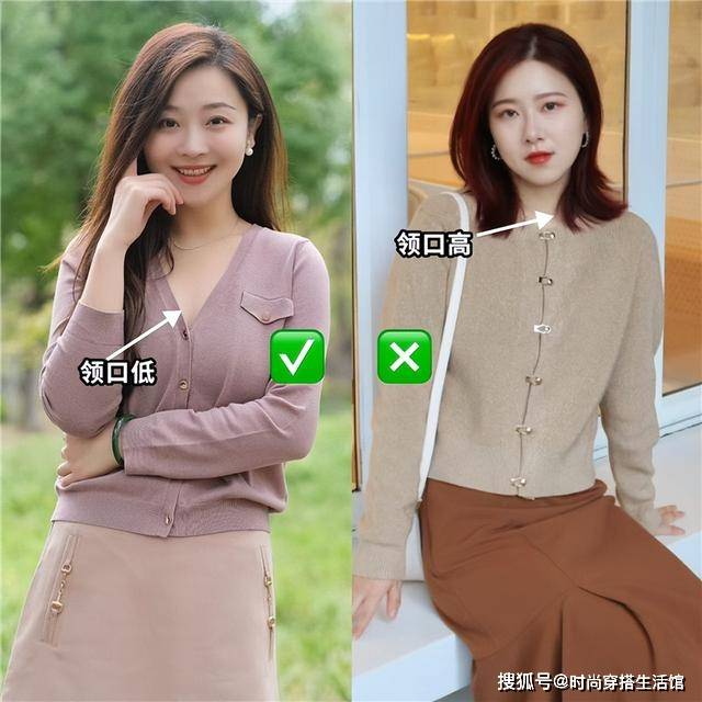 开衫的领口很常见,以圆领和V领为主,但不同的领口又适合不同身形和脸型的人。圆领领口的开衫,比较温柔,设计偏女性化一些,它适合脸小、脖子修长的人穿,能很好地搭出优雅的风格。多适用于正式场合。