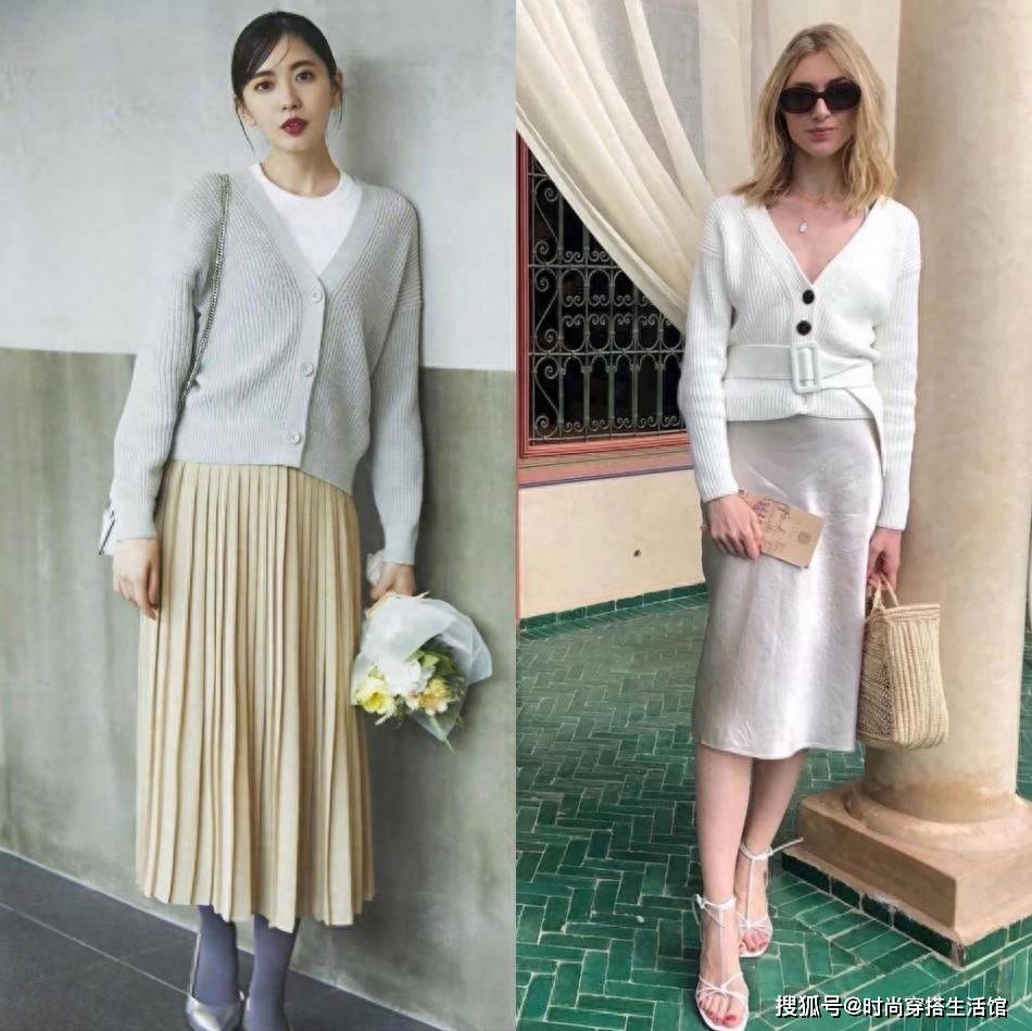 开衫和半身裙的款式,也是针对女性身材优势所设计的,开衫的领口,往往会采用开口处理,露出优美的颈部线条,优雅又迷人。