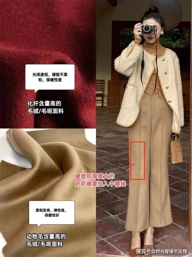 像针织、纯棉、毛呢的面料都是比较合适的,这些面料不仅有比较保暖的穿搭效果,而且看上去也是比较高级的,在保证垂感的同时还会有比较清晰利落的线条感,所以特别适合用在奶奶裤上面来穿搭。