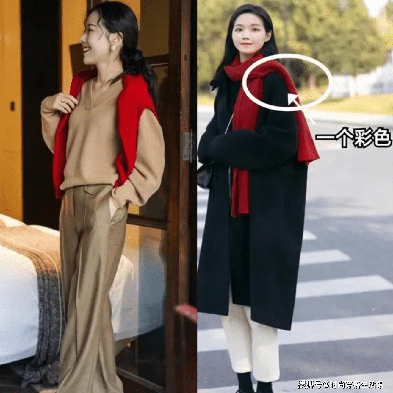 大地色阔腿裤与围巾在颜色上相互呼应也是明智的搭配选择,通过内搭红色让整个人的身材比例更加清晰高挑,最后来一双明亮的黑色帆布鞋点缀穿搭,分分钟美出新高度。