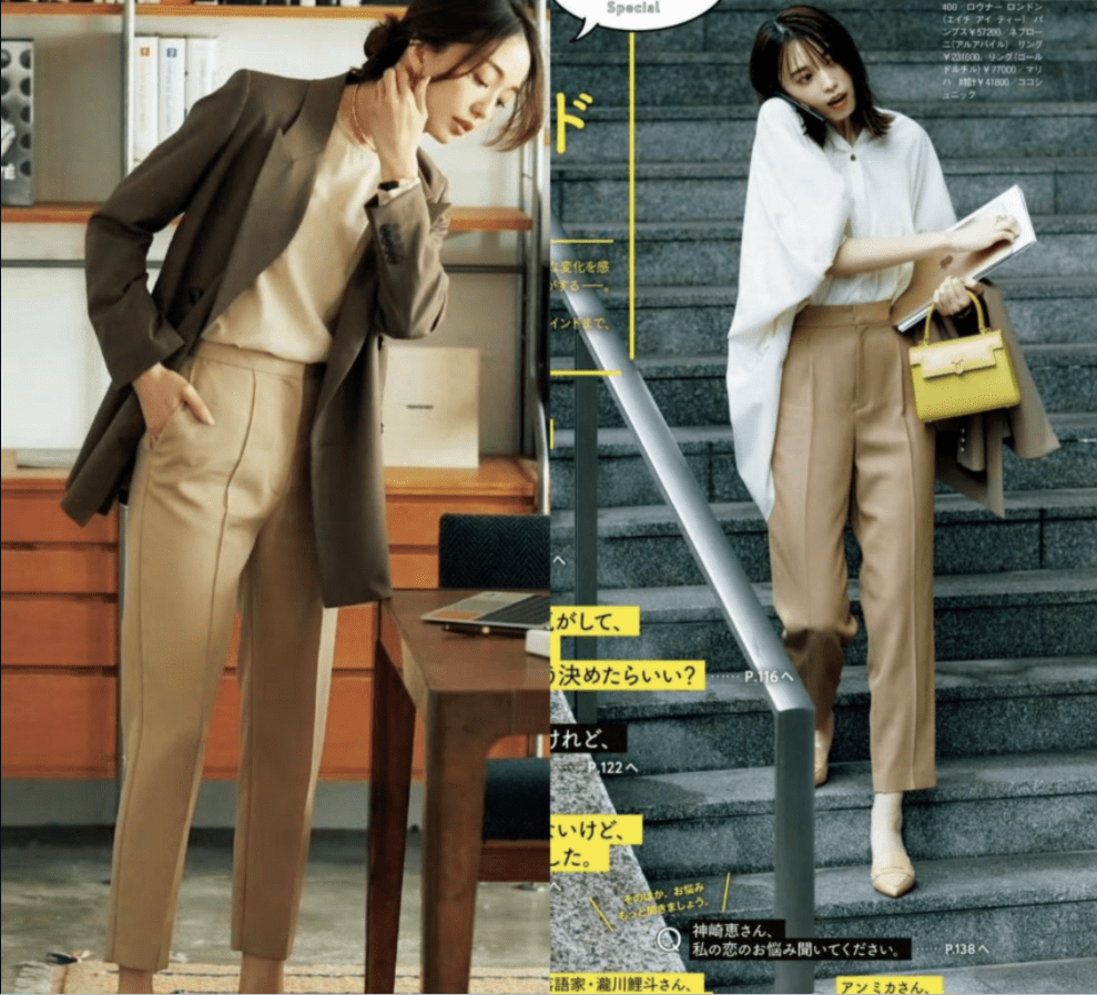 驼色西装裤可以用来构造出很多显瘦的穿搭,而且它的这种色彩也不会让人觉得很有清冷感,有别于白色或是黑色西装裤。
