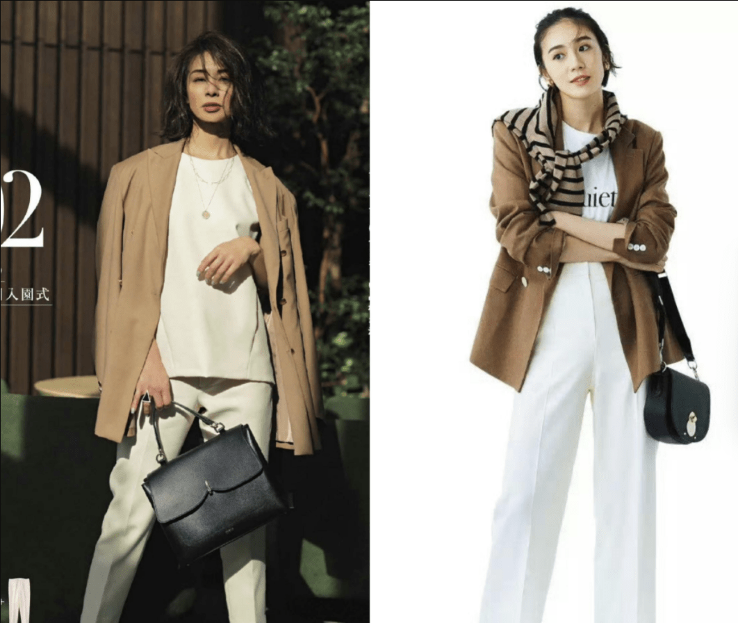 像这两套穿搭,采取的都是驼色外套和白色单品配合,这样就能用大面积的清爽色彩,组合出清新的视觉效果,但又会因为驼色的加入,而减少冷清的气息。