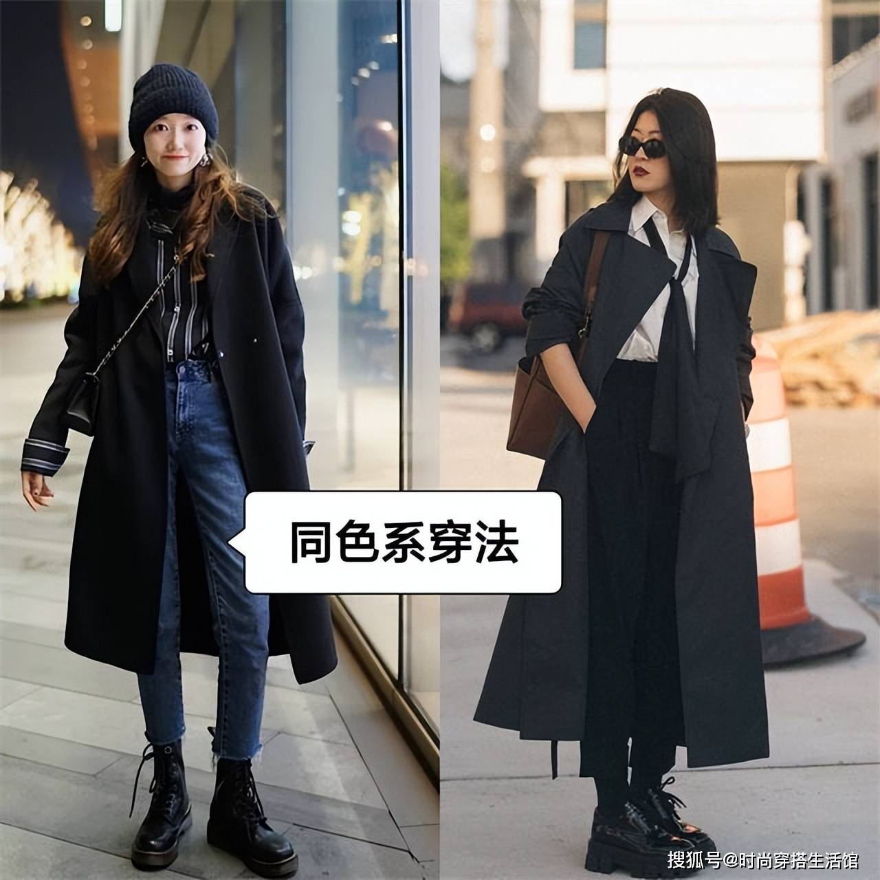 那么,我们就可以运用这种思路在“长大衣+马丁靴”的搭配上,比如穿长大衣+小黑裤+黑色马丁靴,统一下半身配色,提高腿长,也能显高显瘦。