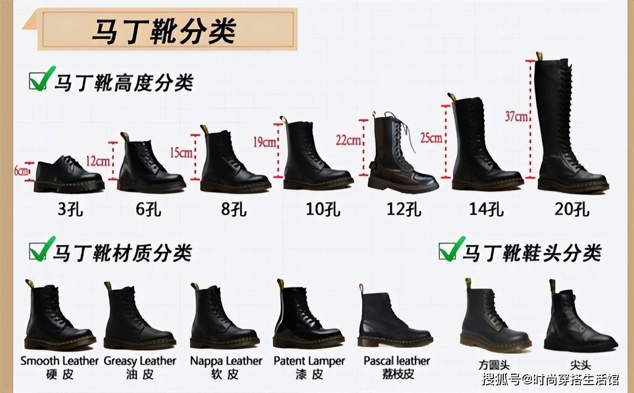 马丁靴的长度有很多种,有6孔,8孔,12孔还有20孔的等等,孔越多,马丁靴的长度则越长,也越难驾驭,平常属8孔最经典,最好驾驭,对于矮个子女生也很友好,对于小腿肚比较粗的女生,一定不要选择12孔以上的靴子,会使小腿变的更粗,变成了萝卜腿,完全没有美感可言。