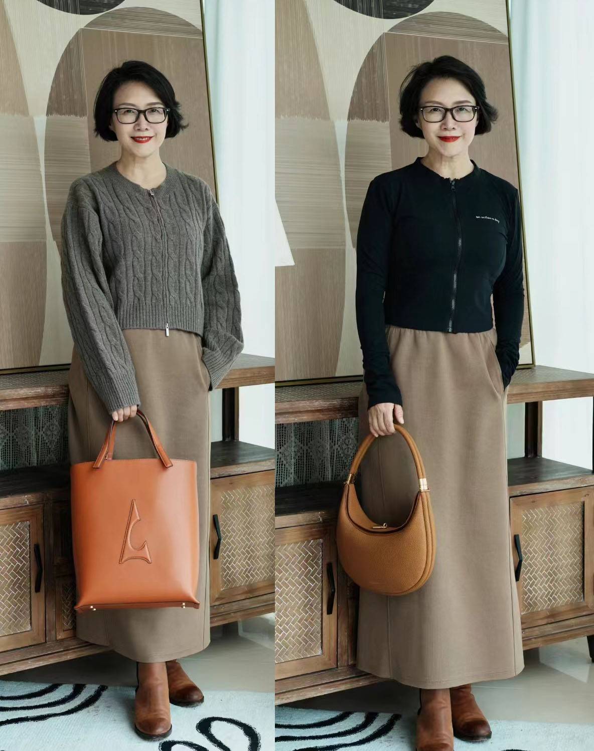 “上短下长”这一穿法的运用是比较普遍的,中年女士可以将重点放在上装的选择,对于腰线的呈现是很关键的。比方说上图这件卡其色半身裙的搭配中,就都采用了衣摆样式较短的上衣,非常轻松的协调了整体量感,尽显优雅高挑的感觉。