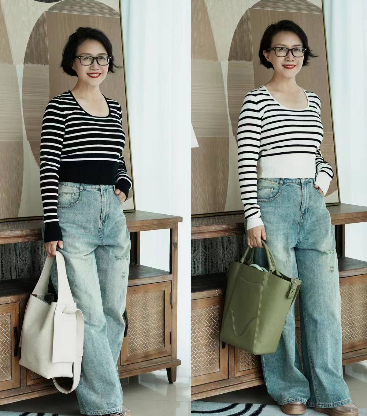 就像是上图这种“上短下长”的造型,不仅显得腿又长、身材又好,还使用了经典的条纹元素与牛仔裤,完美的释放出了更充沛的轻盈感,简约又很时尚吸睛。