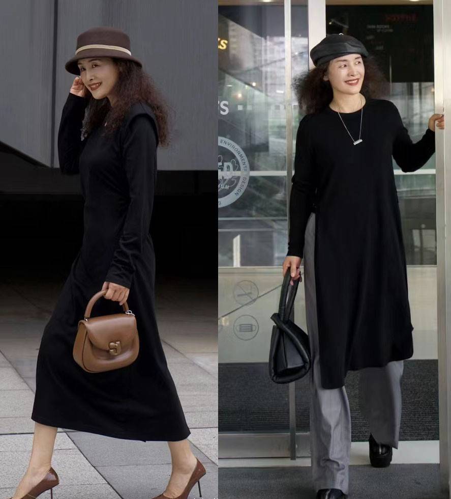 在四五十岁这个年龄段,身材很容易出现发胖的问题,再加上秋冬服装比较厚实,自然也会叠加出更臃肿的感觉,而为了摆脱这一点,可以应用上短下长的技巧。