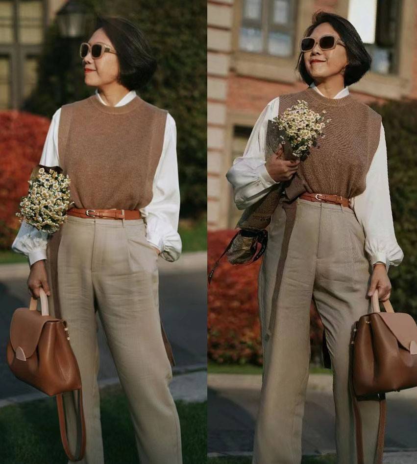 相比于面料轻薄的西装马甲,图中这件针织马甲,上身效果会更为保暖。而图中这位博主运用它与白衬衫进行了结合,面料与配色之间的显著差异感,也能将层次感调整出更鲜明的效果。
