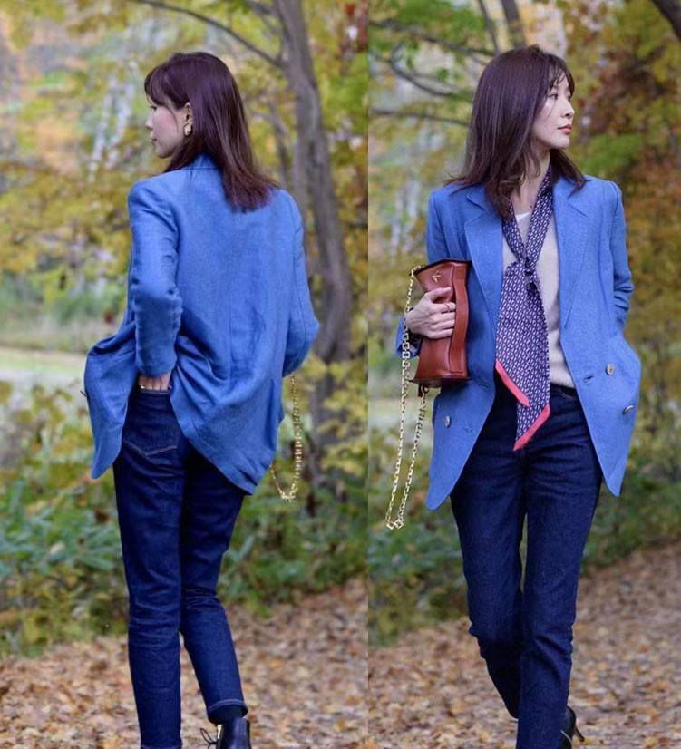 对于用腻了黑白灰的女性而言,蓝色在秋季可以创造出更新鲜的视觉风格,但也同样具有包容感,可以用来平衡彩色的鲜艳,或是深色的暗沉。