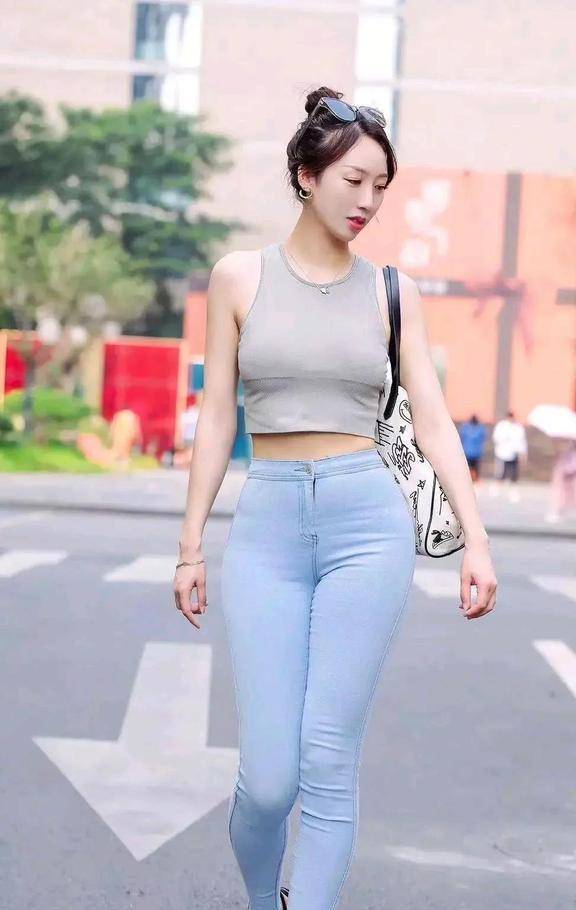 街拍:女生穿紧身牛仔裤,搭配短款上衣,修身又显高你学会了吗?