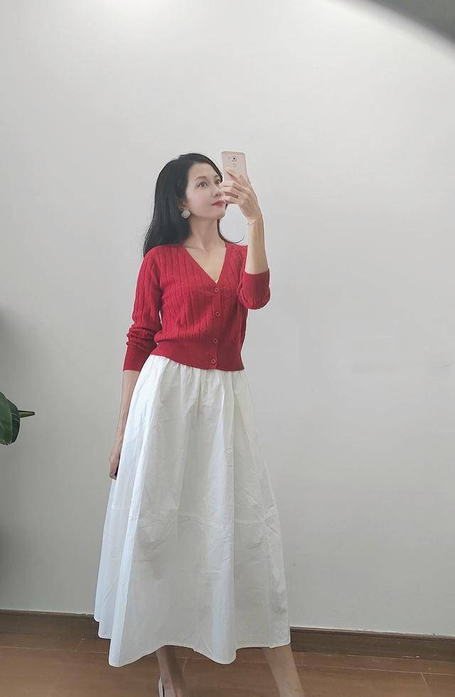 白色高腰伞裙真的很像一位优雅的贵族,高腰设计,使得腰部线条的优美,显高显瘦,而且也会显得腰身很纤细。红色针织衫搭配白色伞裙,真的很优雅,很多场合都能hold得住,而且把女性的温婉也展现得淋漓尽致。红色的针织衫,显得特别有活力还有温柔感,而且减龄。整体搭配显得特别清新灵动。