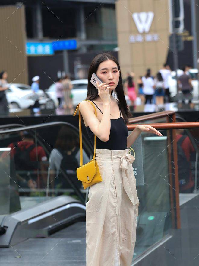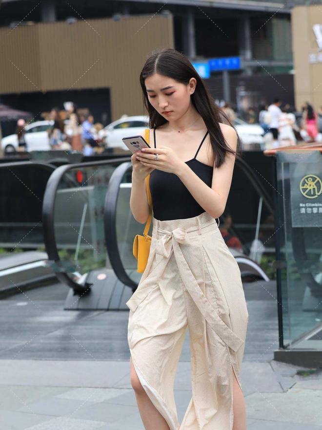 搭配这种裤子的时候,选择的上衣都是很修身的。这里是用一个黑色的无袖背心来搭配这个杏色裤子,黑色是一个很显瘦的颜色,而且这还是一个比较修身的背心,在裤子的对比下会显得我们更瘦,而且这样穿还能提高腰线,显得腿很长。