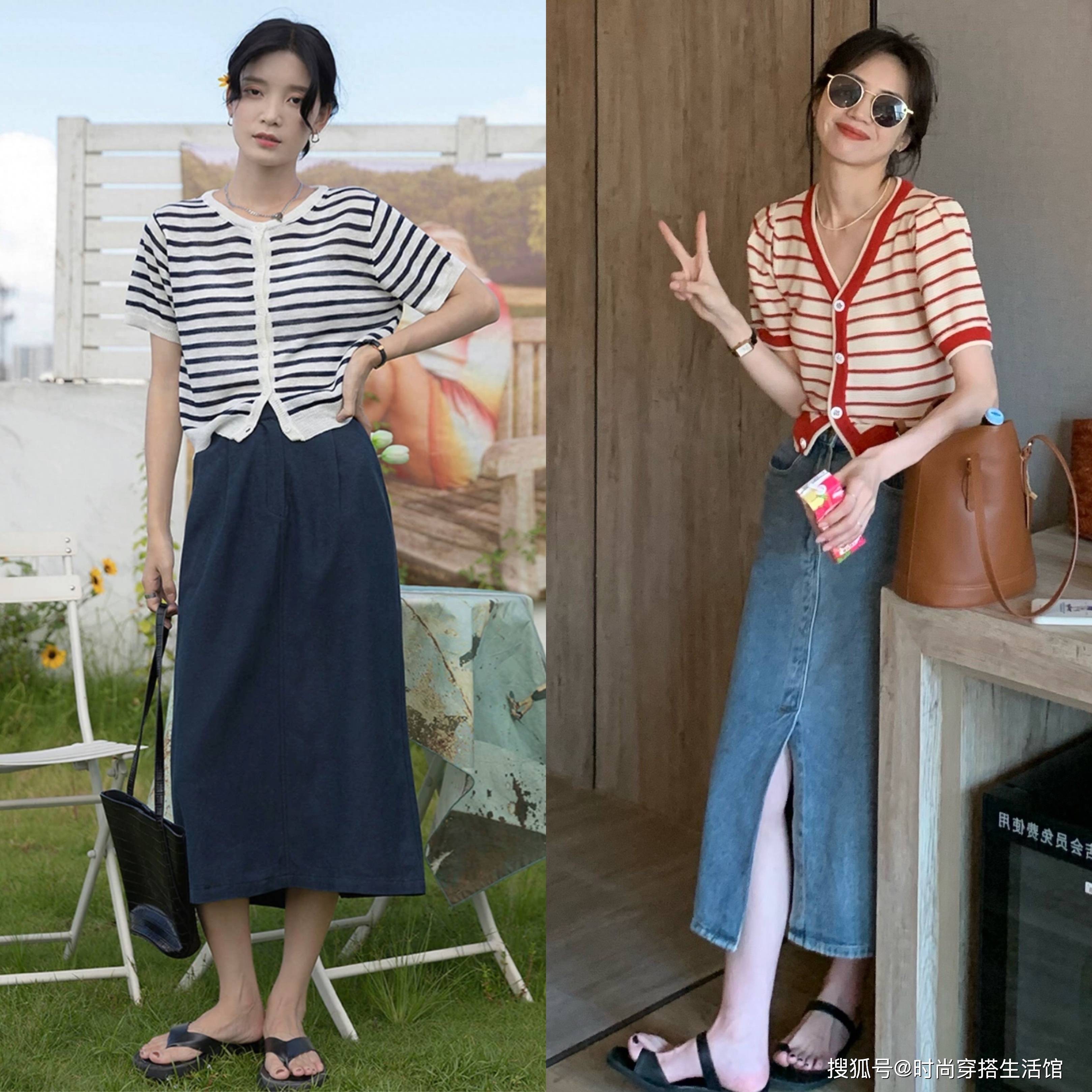搭配开衫和半身裙的时候,露出颈部线条和脚踝线条是很重要的,如果半身裙的长度过于拖沓,那么小开衫的优势也会被降低。上衣和下装的款式要形成一定的互补关系,比如小开衫的款式要露出锁骨线条,而半身长裙的款式,则要宽阔且露出脚踝。