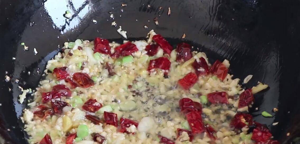 4、锅中再次倒入适量食用油。当油热时,加入切碎的姜、蒜末和葱白。减少热量并炒至香气释放。油爆香后,加入切碎的干辣椒和少许葱。一把花椒,不断搅拌,带出干辣椒和花椒的香气;