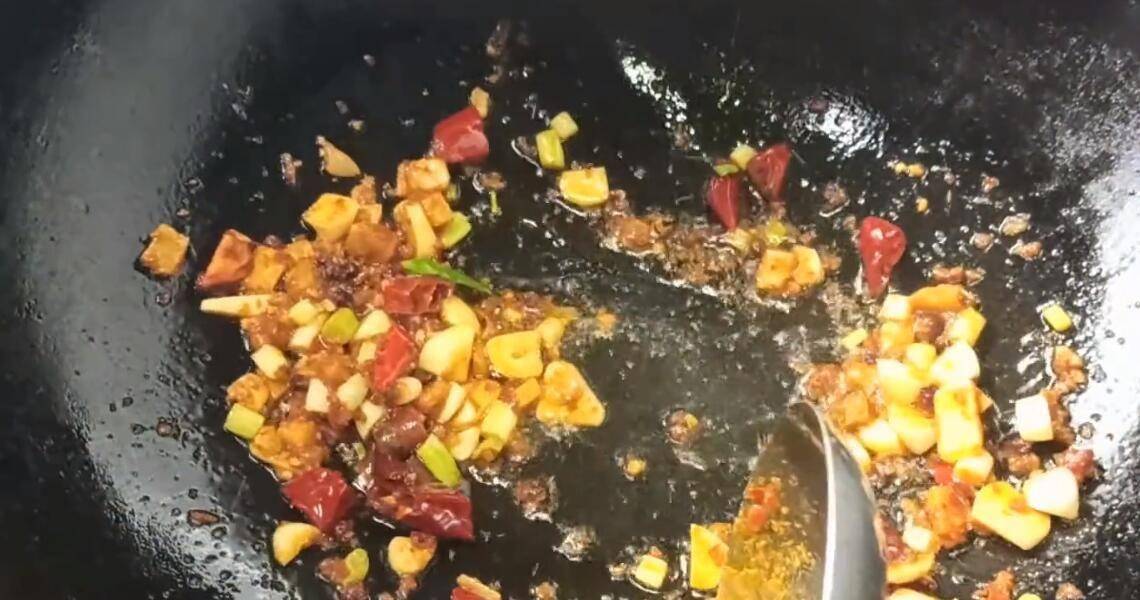4、锅内留少量底油。当油热时,加入切碎的大蒜、姜、葱、干辣椒片和一把花椒。转小火,炒香。边搅拌边炒香。加入一勺郫县豆瓣酱,继续小火翻炒至红油出;