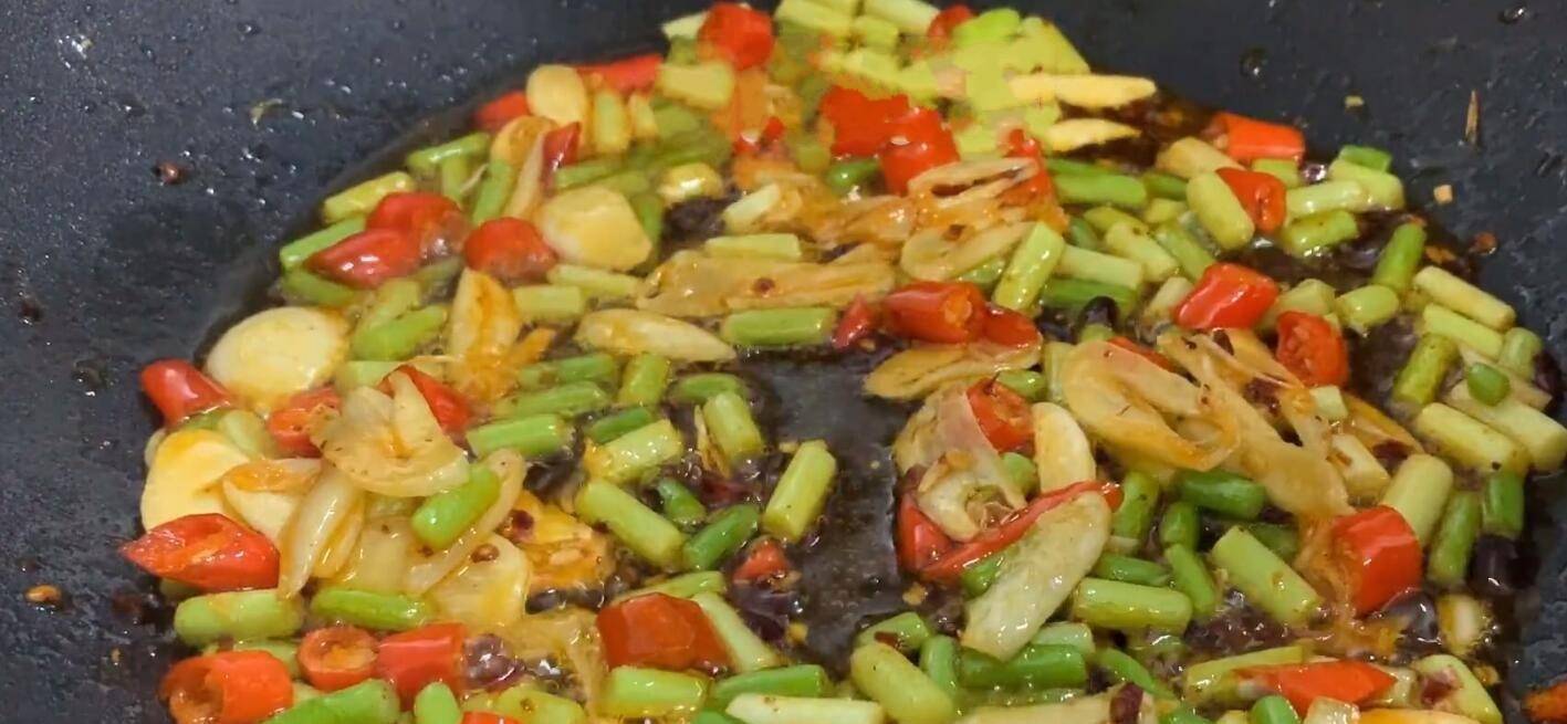 4.将足够的食用油倒入锅中。当油热时,加入切碎的青椒和大蒜。将火调至中火,炒至香味散出。待香气释放后,加入一勺郫县豆继续。煎至出棕色油。加入切碎的大蒜,快速炒约1分钟;