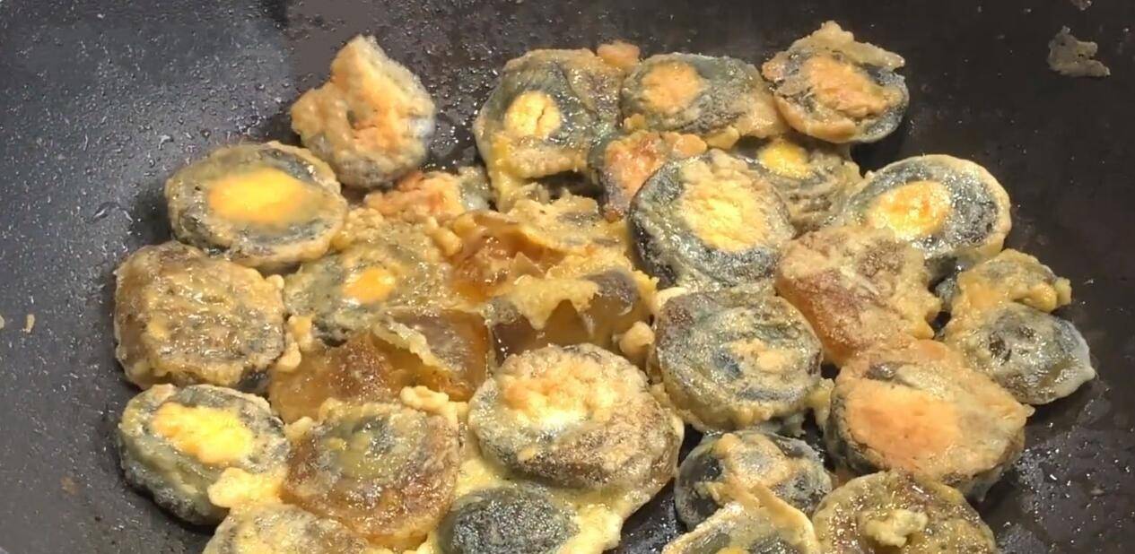 3、取出锅,倒入食用油,油热时,将皮蛋和蛋水一颗一颗加入,小火慢煎,一面煎至金黄后,重复继续煎煎至两面焦黄,盛入盘中备用;