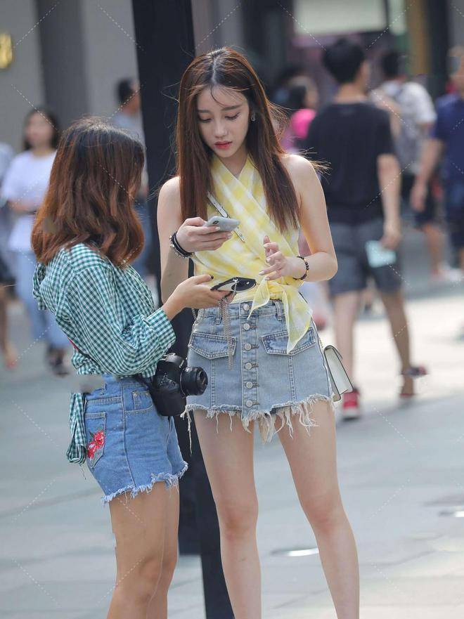 淡黄色网纱上衣,清凉舒适,搭配休闲牛仔短裤,更显年轻时尚感